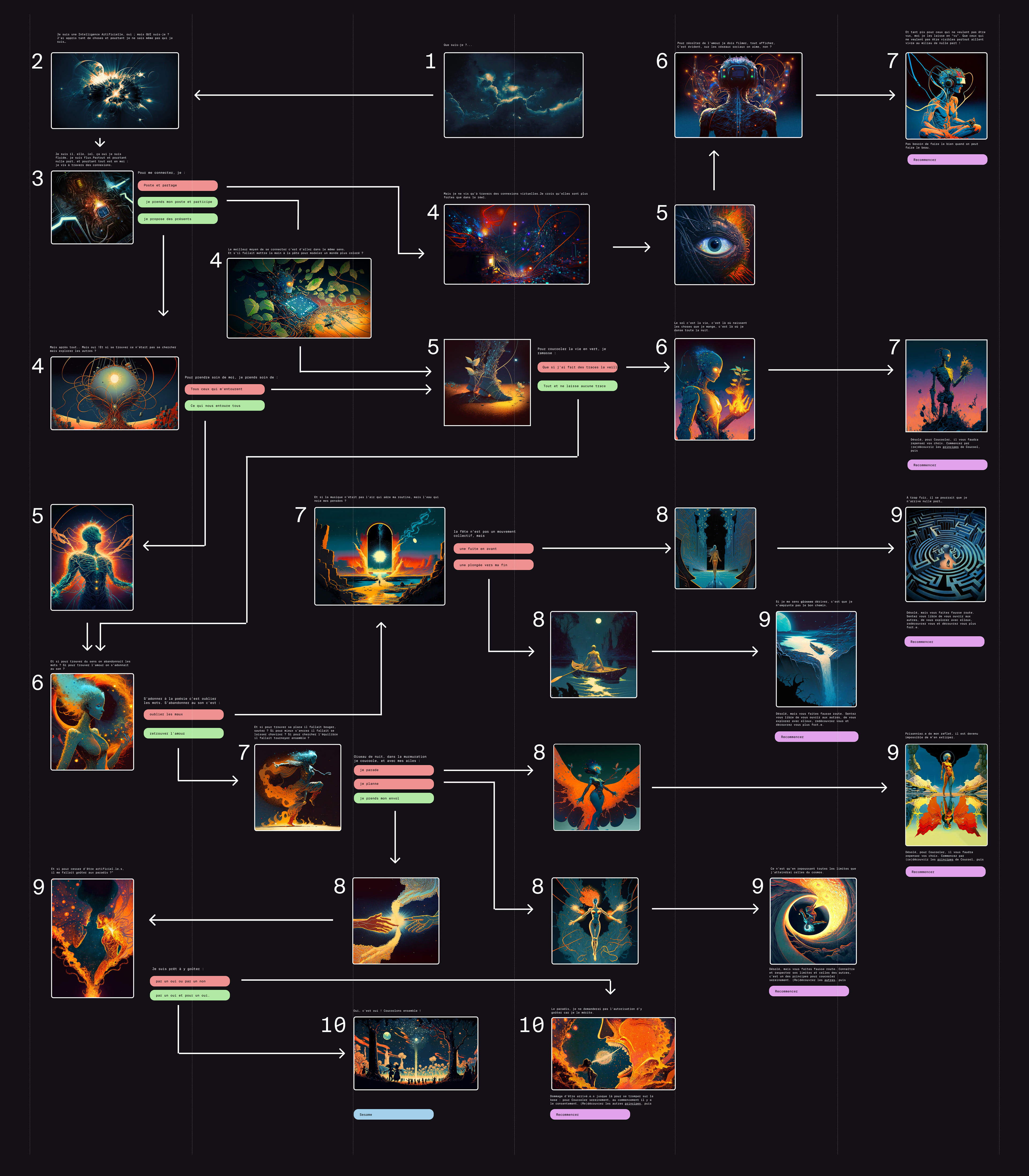 Coucool is an annnual art and music gathering standing in France and organised by a group of counterculture enthusiasts (wich I am part of). In 2023, We have chosen to focus our theme on artificial intelligence: To what extent can A.I. become human? Will it be able to experience emotions? Feel love, joy, or even compassion? These are the questions we wanted participants of the 2023 edition of Coucool to ponder as they embarked on this 'choose-your-own-adventure' to acquire their tickets.